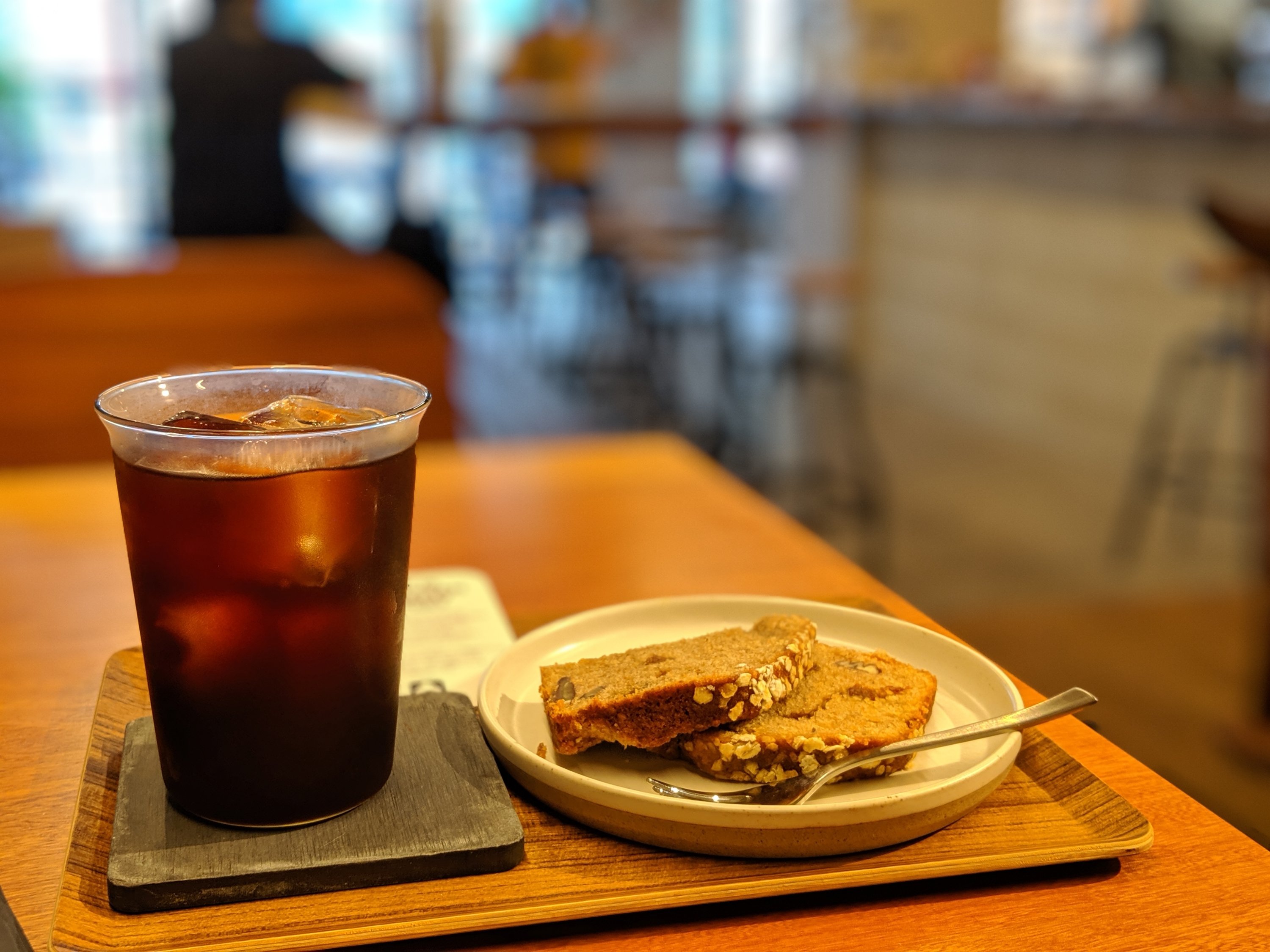 バナナブレッドはしっとりしていて食べやすいです。アイスコーヒーはさっぱりと浅煎り系。いい組み合わせ。